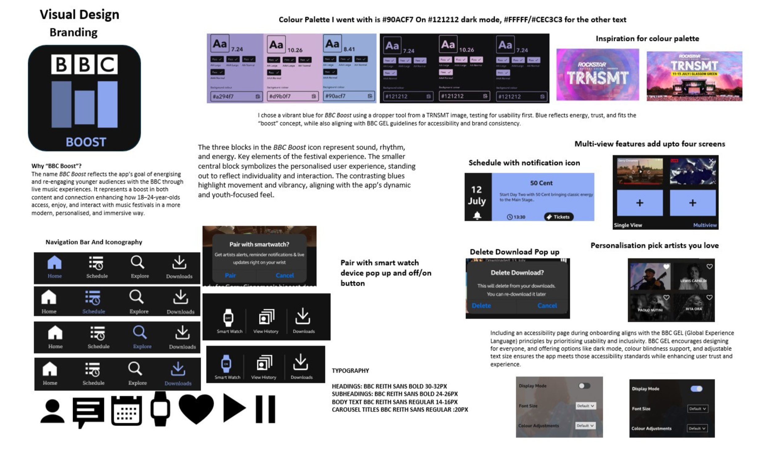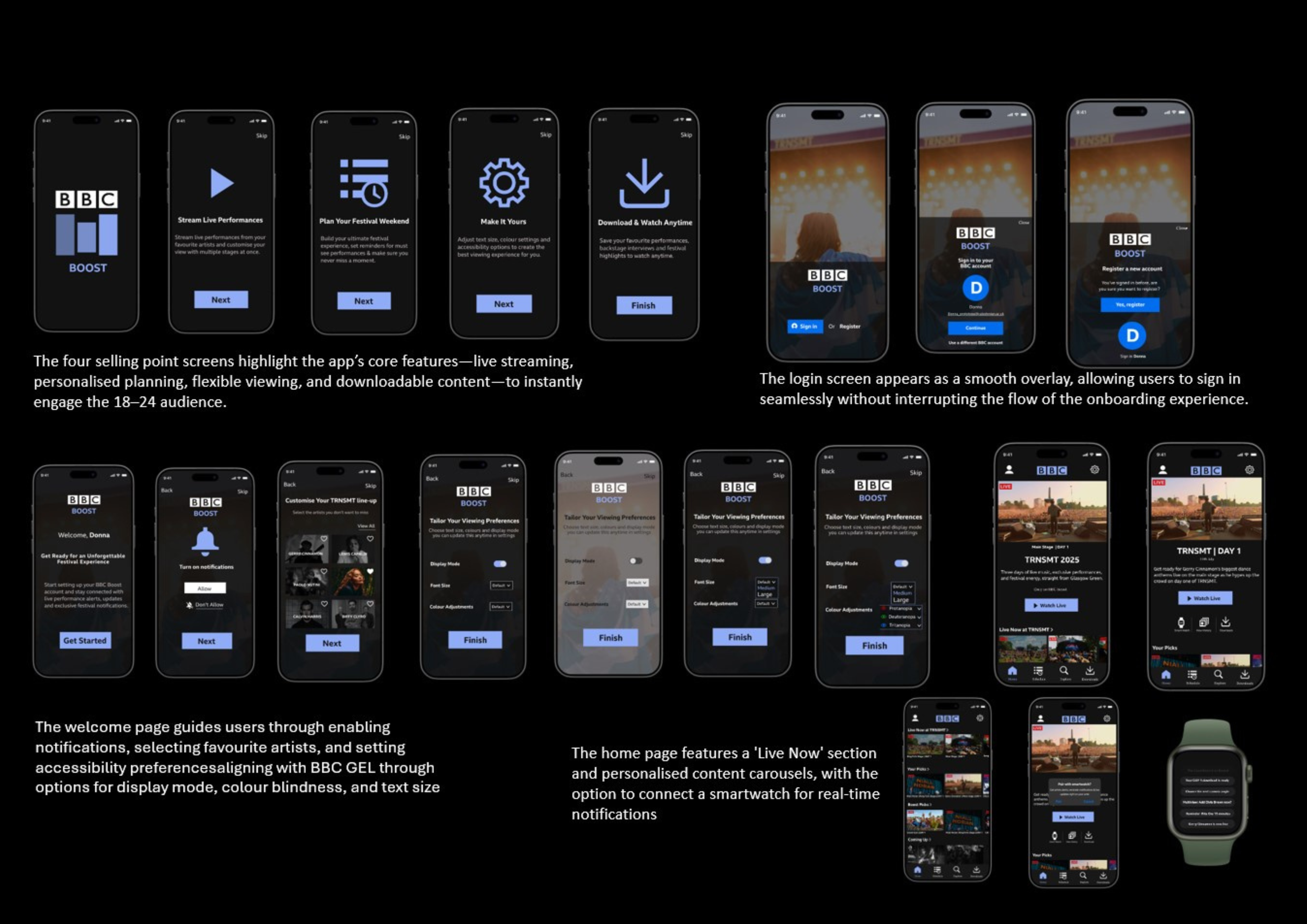 BBC Boost is a mobile app concept developed in response to declining engagement with BBC content among 18–24 year olds. Using TRNSMT as a case study, the app brings live festival performances to audiences who could not attend in person, while aligning with the BBC’s public service values and accessibility standards.