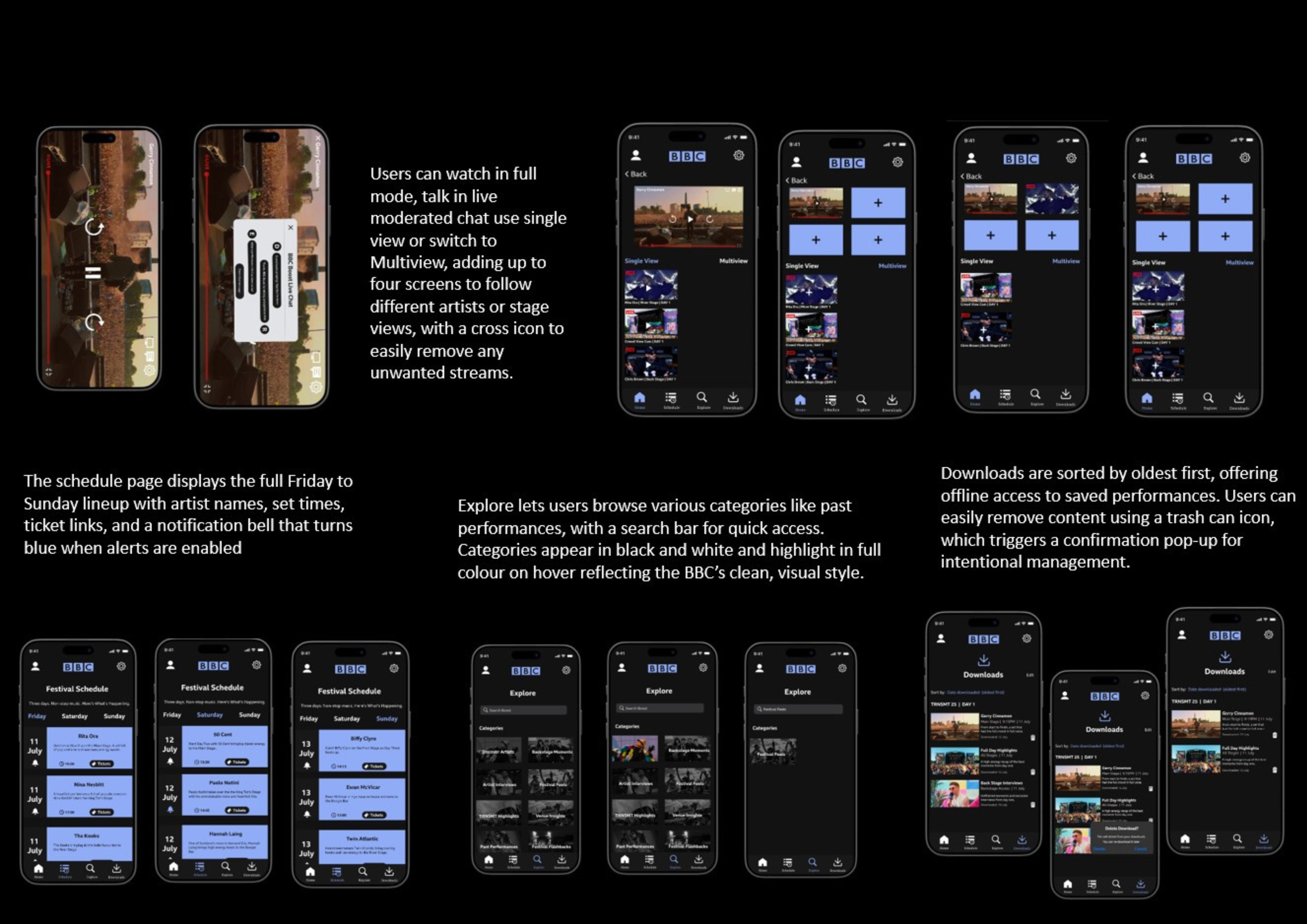 Key features include multiview live streaming, personalised schedules and artist alerts, moderated live chat, smartwatch notifications for real time updates, and offline downloads to support flexible, on the go viewing.